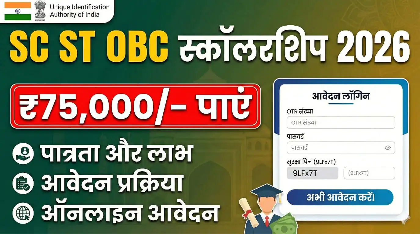 SC ST OBC Scholarship 2026: भारत में उच्च शिक्षा का खर्च कई परिवारों के लिए बड़ी चुनौती बन जाता है, खासकर अनुसूचित जाति (SC), अनुसूचित जनजाति (ST) और अन्य पिछड़ा वर्ग (OBC) से आने वाले विद्यार्थियों के लिए। फीस, किताबें, हॉस्टल और अन्य शैक्षणिक खर्च उठाना आसान नहीं होता। इसी समस्या को ध्यान में रखते हुए सरकार द्वारा SC ST OBC Scholarship 2026 शुरू की गई है, ताकि योग्य छात्रों को आर्थिक सहायता मिल सके और वे बिना वित्तीय दबाव के अपनी पढ़ाई जारी रख सकें।